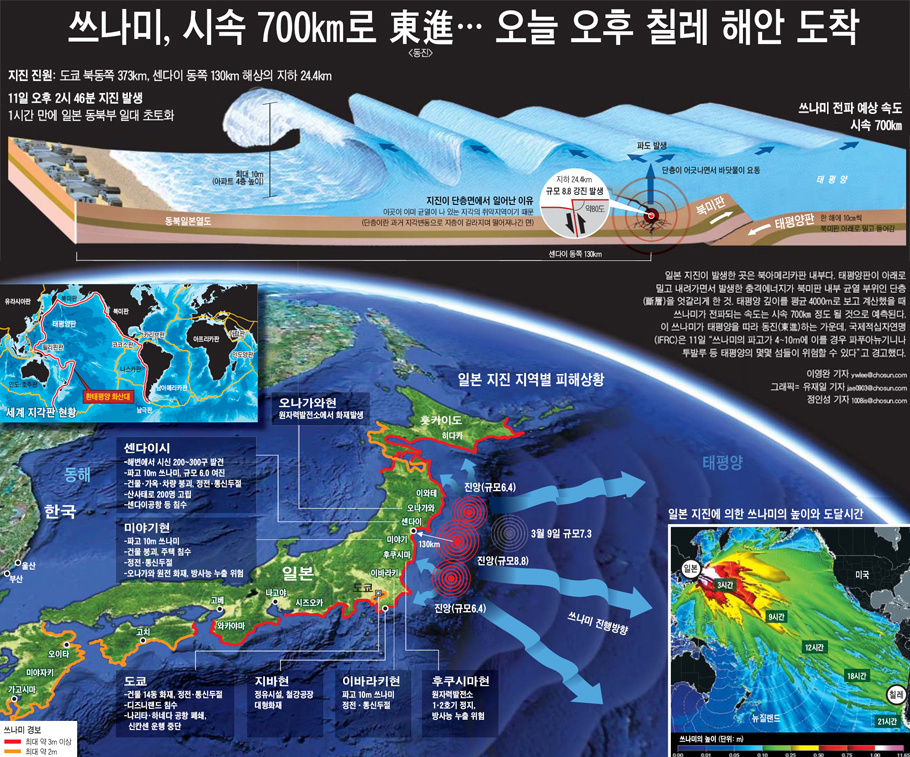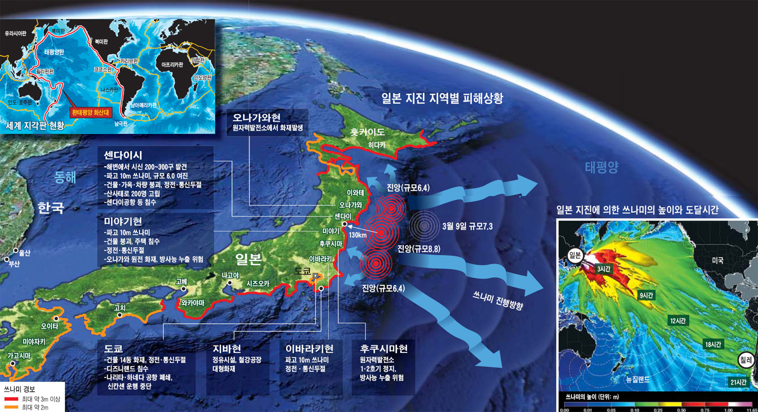 ¡ã ÀϺ» ÁöÁøÀÌ ¹ß»ýÇÑ °÷Àº ºÏ¾Æ¸Þ¸®Ä«ÆÇ ³»ºÎ´Ù. ÅÂÆò¾çÆÇÀÌ ¾Æ·¡·Î ¹Ð°í ³»·Á°¡¸é¼ ¹ß»ýÇÑ Ãæ°Ý¿¡³ÊÁö°¡ ºÏ¹ÌÆÇ ³»ºÎ ±Õ¿µ ºÎÀ§ÀÎ ´ÜÃþÀ» ¾ù°¥¸®°Ô ÇÑ °Í. ÅÂÆò¾ç ±íÀ̸¦ Æò±Õ 4000m·Î º¸°í °è»êÇßÀ» ¶§ ¾²³ª¹Ì°¡ ÀüÆÄµÇ´Â ¼Óµµ´Â ½Ã¼Ó 700km Á¤µµ µÉ °ÍÀ¸·Î ¿¹ÃøµÈ´Ù. ÀÌ ¾²³ª¹Ì°¡ ÅÂÆò¾çÀ» µû¶ó µ¿ÁøÇÏ´Â °¡¿îµ¥, ±¹Á¦Àû½ÊÀÚ¿¬¸Í(IFRC)Àº 11ÀÏ "¾²³ª¹Ì ÆÄ°í°¡ 4~10m¿¡ À̸¦ °æ¿ì ÆÄǪ¾Æ´º±â´Ï³ª Åõ¹ß·ç µî ÅÂÆò¾çÀÇ ¸î¸î ¼¶µéÀÌ À§ÇèÇÒ ¼ö ÀÖ´Ù"°í °æ°íÇß´Ù. ¢º±â»ç ´õ ÀÚ¼¼È÷ º¸±â