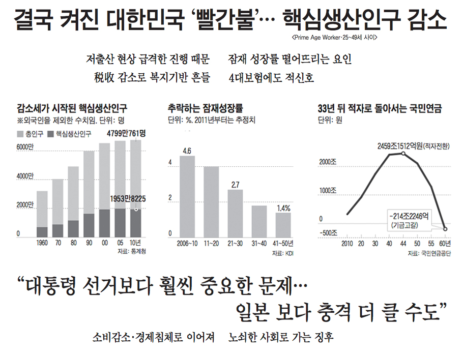 'Çٽɻý»êÀα¸(prime age worker)'´Â »ý»ê°¡´ÉÀα¸(15~64¼¼) Áß °æÁ¦È°µ¿ÀÌ °¡Àå Ȱ¹ßÇÑ ½Ã±âÀÎ 25~49¼¼¿¡ ÇØ´çÇÏ´Â Àα¸´Ù. 14ÀÏ Åë°èûÀÇ 2010³â Àα¸ ÃÑÁ¶»ç °á°ú¿¡ µû¸£¸é ÀÛ³â 11¿ù 1ÀÏ ÇöÀç ¿ì¸®³ª¶ó Çٽɻý»êÀα¸´Â 1953¸¸8000¸íÀ» ±â·Ï, Áö³ 2005³â(1990¸¸5000¸í)¿¡ ºñÇØ 36¸¸7000¸í ÁÙ¾ú´Ù. Çٽɻý»êÀα¸°¡ °¨¼ÒÇÑ °ÍÀº 1949³â Àα¸ ÃÑÁ¶»ç¸¦ ½Ç½ÃÇÑ ÀÌÈÄ Ã³À½ÀÌ´Ù. ¢º ±â»ç ´õ ÀÚ¼¼È÷ º¸±â
