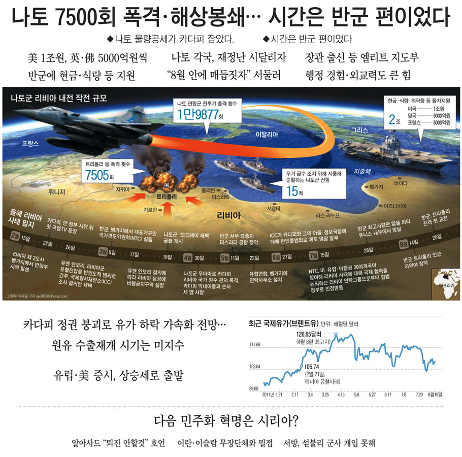 ¡ã ³ªÅä(NATO) ¼¹æ¿¬ÇÕ±ºÀº Áö³ 3¿ù "Ä«´ÙÇÇ Á¤±ÇÀÇ ½ÃÀ§´ë ÇлìÀ» ¸·¾Æ´Þ¶ó"´Â ¹Ý±ºÀÇ ¿äû¿¡ µû¶ó À¯¿£ °áÀǸ¦ °ÅÃÄ ¸®ºñ¾Æ ³»Àü¿¡ ¶Ù¾îµé¾ú´Ù. ³ªÅä´Â ºñÇà±ÝÁö±¸¿ª ¼³Á¤°ú °æÁ¦Á¦Àç·Î Ä«´ÙÇÇ Á¤ºÎ±ºÀÇ ¼Õ¹ßÀ» ¹¾î³õÀº »óÅ¿¡¼ '¿Àµð¼¼ÀÌÀÇ »õº®' ÀÛÀü(3¿ù 19ÀÏ)À» ½ÃÀÛÇß´Ù. Áö³ 5°³¿ù°£ 7505ȸ ¸®ºñ¾ÆÀÇ »ó°øÀ» ³¯¸ç °øÁ߯ø°ÝÀ» ÆÛºÎ¾ú´Ù. ÁöÁßÇØ¿£ Àá¼öÇÔµéÀÌ ´ë±âÇϸç Ä«´ÙÇÇÀÇ ¸ñÀ» °Ü´³´Ù. ¢º ±â»ç ´õ ÀÚ¼¼È÷ º¸±â