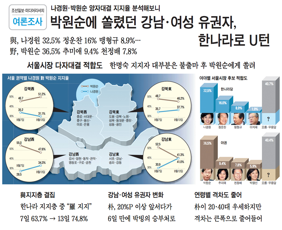 ¡ã Á¶¼±ÀϺ¸°¡ ¹Ìµð¾î¸®¼Ä¡¿¡ ÀÇ·ÚÇØ Áö³ 13ÀÏ ½Ç½ÃÇÑ ¼¿ï½ÃÀå º¸¼± °¡»ó ¾çÀÚ ´ë°á ¿©·ÐÁ¶»ç¿¡¼ ¹Ú¿ø¼ø º¯È£»ç(46.5%)´Â Çѳª¶ó´ç ³ª°æ¿ø ÃÖ°íÀ§¿ø(36.2%)¿¡°Ô 10.3%Æ÷ÀÎÆ® ¿ì¼¼Çß´Ù. ÇÏÁö¸¸ Áö³ 7ÀÏ °°Àº ±â°ü Á¶»çÀÇ 18.6%Æ÷ÀÎÆ®º¸´Ù´Â ±× Â÷À̰¡ Å©°Ô ÁÙ¾ú´Ù. ¹Ú º¯È£»ç´Â ¾ß±Ç ¼¿ï½ÃÀå È帷Π°Å·ÐµÇ´ø ¾Èö¼ö ¼¿ï´ë À¶ÇÕ°úÇбâ¼ú´ëÇпøÀå°ú ÇѸí¼÷ Àü ÃѸ®°¡ ÀÕµû¶ó ºÒÃ⸶ÇÏ¸é¼ ÁöÁöÀ² »ó½ÂÀÌ Áö¼ÓµÉ °ÍÀ¸·Î ¿¹»óµÆÁö¸¸, ¿ÀÈ÷·Á Ãß¼® Á÷ÈÄ¿¡ ÁöÁöÀ²ÀÌ ¶³¾îÁ³´Ù. ¢º ±â»ç ´õ ÀÚ¼¼È÷ º¸±â