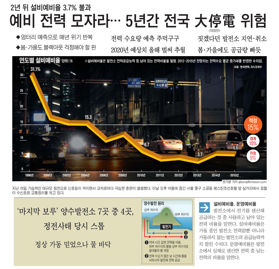 ¡ã 19ÀÏ Áö½Ä°æÁ¦ºÎ ±¹Á¤°¨»çÀå. ¿°¸íõ Àü·Â°Å·¡¼Ò ÀÌ»çÀåÀº "°ú°Å¿¡µµ ¿î¿ë ¿¹ºñ·Â(¹ßÀü¼Ò¿¡¼ ½ÇÁ¦·Î »ý»êÇÑ Àü·Â·® Áß ³²¾ÆÀÖ´Â Àü·Â)ÀÌ 100¸¸kW ÀÌÇÏÀÎ »óȲÀÌ ÀÖ¾ú´Ù"°í ½ÇÅäÇß´Ù. ¿¹Àü¿¡µµ Áö³ 15Àϰú °°Àº Àü±¹ÀÌ µ¿½Ã¿¡ Á¤ÀüµÇ´Â 'ÅäÅÐ ºí·¢¾Æ¿ô(total black out¡¤´ëÁ¤Àü)' À§±â°¡ ÀÖ¾ú´Âµ¥, ´ÙÇàÈ÷ ³Ñ¾î°¬´Ù´Â °ÍÀ̾ú´Ù. ¢º ±â»ç ´õ ÀÚ¼¼È÷ º¸±â