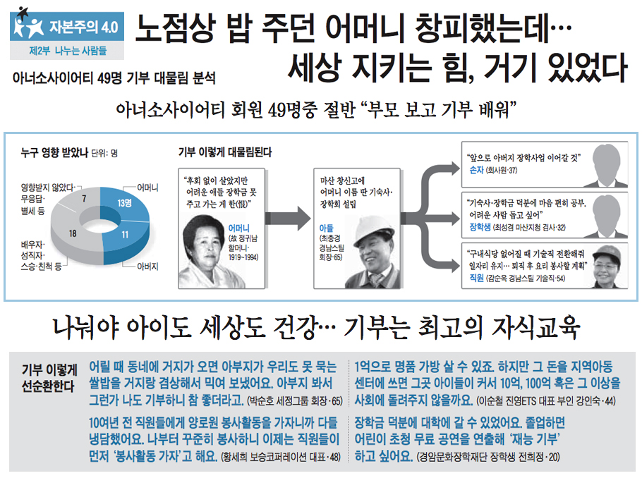 ¡ã ±âºÎ´Â 'ÀÚº»ÁÖÀÇ 4.0 ½Ã´ë'ÀÇ ÇÙ½ÉÀÌ´Ù. ´Ü¼øÈ÷ ´ç´ë¿¡ Àç¹°À» ÀçºÐ¹èÇÏ´Â µ¥ ±×Ä¡Áö ¾Ê°í, ÇÑ ¼¼´ë¿¡¼ ´ÙÀ½ ¼¼´ë·Î °øµ¿Ã¼¿Í »çȸÅëÇÕÀÇ °¡Ä¡¸¦ ´ë¹°¸²ÇÏ´Â Åë·Î°¡ µÇ±â ¶§¹®ÀÌ´Ù. °³ÀÎ µ· 1¾ï¿ø ÀÌ»ó ±âºÎÇÑ '¾Æ³Ê¼Ò»çÀÌ¾îÆ¼' ȸ¿øµéÀÇ ºÎ¸ð°¡ Àڽĵ鿡°Ô ¹°·ÁÁØ °Íµµ ÀÌ·± ¹ÏÀ½À̾ú´Ù. ºÎ¸ð¿¡°Ô ±âºÎ¸¦ ¹è¿ü´Ù´Â ÀÀ´ä(¾î¸Ó´Ï 13¸í¡¤¾Æ¹öÁö 11¸í)ÀÌ µÎµå·¯Áö°Ô ¸¹¾Ò´Ù. ÇýÅùÞÀº »ç¶÷ÀÌ ³ª´©°í, ³ª´²¹ÞÀº ¸¸Å ´Ù¸¥ À̵鿡°Ô µÇµ¹·Á °±´Â '±âºÎ ¼±¼øÈ¯(à¼âàü½)'ÀÇ Áß½ÉÀÌ °¡Á·¿¡ ÀÖ¾ú´Ù. ¢º ±â»ç ´õ ÀÚ¼¼È÷ º¸±â