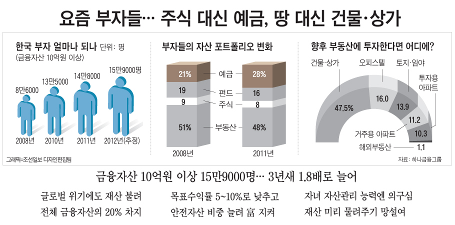 ¡ã ¿ì¸®³ª¶ó¿¡¼ 10¾ï¿ø ÀÌ»ó ±ÝÀ¶ÀÚ»ê(¿¹±Ý, Áֽġ¤Ã¤±Ç, ÆÝµå µîÀ» ÇÕÄ£ °Í)À» °¡Áø ÃÖ»óÀ§ ºÎÀÚ°¡ 15¸¸9000¸í¿¡ À̸£´Â °ÍÀ¸·Î Á¶»çµÆ´Ù. ÀÌ´Â ±Û·Î¹ú ±ÝÀ¶ À§±â°¡ ¹ß»ýÇß´ø 2008³â 8¸¸6000¸í¿¡ ºñÇϸé 1.8¹è·Î ´Ã¾î³ °ÍÀÌ´Ù. À̵éÀÌ º¸À¯ÇÑ ÃÑ ±ÝÀ¶ÀÚ»ê ±Ô¸ðµµ ±Û·Î¹ú ±ÝÀ¶ À§±â ÀÌÈÄ 42% ´Ã¾î³ª Àüü °³ÀÎ ±ÝÀ¶ÀÚ»ê(¾à 2200Á¶¿ø)ÀÇ 20%¸¦ Â÷ÁöÇϰí ÀÖ´Â °ÍÀ¸·Î ³ªÅ¸³µ´Ù. ¢º ±â»ç ´õ ÀÚ¼¼È÷ º¸±â