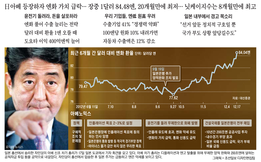 ¡ã 16ÀÏ ÀϺ» ÃѼ±¿¡¼ ÀڹδçÀÌ ¾Ð½ÂÇÏÀÚ ¾Æº£ ½ÅÁ¶(äÌÛÃòÌß²) Â÷±â ÃѸ®ÀÇ °æÁ¦ Á¤Ã¥¿¡ ´ëÇÑ ±â´ë°¨À¸·Î ÀϺ»ÀÇ ÁÖ°¡°¡ ±ÞµîÇÏ°í ¿£Àº ¾à¼¼¸¦ º¸À̰í ÀÖ´Ù. ¹Ý¸é ¿ì¸®³ª¶ó ¿øÈ´Â 15°³¿ù ¸¸¿¡ °¡Àå ³·Àº ¼öÁØÀ¸·Î ¶³¾îÁ³´Ù. ¢º ±â»ç ´õ ÀÚ¼¼È÷ º¸±â