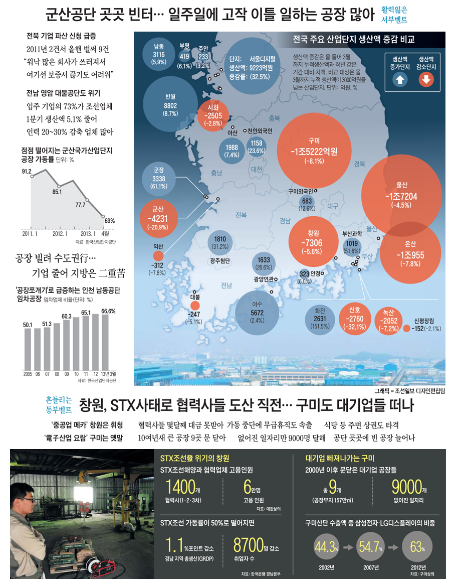 ¡ã ¼ÇØ¾È °ø¾÷º§Æ®ÀÇ °ÅÁ¡Àº ±º»ê ±¹°¡»ê¾÷´ÜÁö´Ù. ÀüºÏ ÃÖ´ë °ø¾÷´ÜÁöÀÎ À̰÷¿£ Çö´ëÁß°ø¾÷°ú Çѱ¹GM, µÎ»êÀÎÇÁ¶óÄÚ¾î, ¼¼¾ÆÁ¦°, OCI µî 5°³ ´ë±â¾÷°ú Çù·Â¾÷üµéÀÌ ÀÔÁÖÇØ ÀÖ´Ù. ±º»ê1¡¤2»ê¾÷´ÜÁö, ÀÚÀ¯¹«¿ªÁö¿ª µî 3°÷¿¡ ÀÖ´Â ±â¾÷ü´Â ¸ðµÎ 571°³(Áö³ 3¿ù ±âÁØ). ÃÑ 1¸¸8000¸íÀÇ ±Ù·ÎÀÚ°¡ ÀÏÇϰí ÀÖ´Ù. Áö³ÇØ »ý»ê¾×Àº 10Á¶3000¾ï¿øÀ¸·Î ÀüºÏ Áö¿ª Àüü »ý»ê¾×ÀÇ 30%¿¡ À°¹ÚÇÑ´Ù. ¢º ±â»ç ´õ ÀÚ¼¼È÷ º¸±â