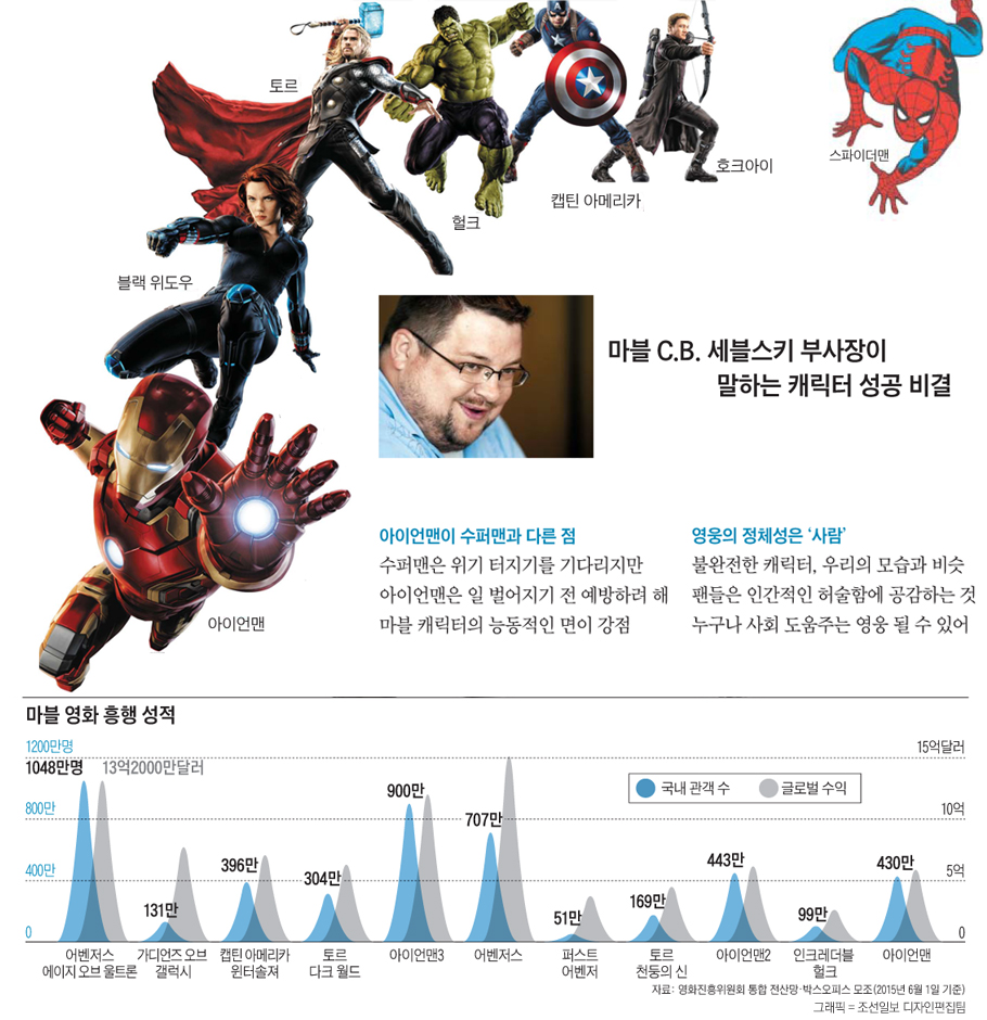 ¡ã '¸¶ºí(Marvel)' ¿Ç³ÀÌ´Ù. 2008³â ¿µÈ '¾ÆÀ̾ð¸Ç'À» ½ÃÀÛÀ¸·Î ÃÖ±Ù '¾îº¥Àú½º2'¿¡ À̸£±â±îÁö ¿µÈ 11ÆíÀ» ÅëÇØ Çѱ¹¿¡¼¸¸ ´©Àû °ü°´ ¾à 4700¸¸¸íÀ» ²ø¾î ¸ð¾Ò´Ù. ±×·¯³ª ´Ù¸¥ ³ª¶ó¿Í ºñ±³Çϸé Çѱ¹¿¡¼ ¾òÀº Àαâ´Â º°·Î ´ë´ÜÇÑ °Ô ¸ø µÈ´Ù. ±Û·Î¹ú ¹Ú½º ¿ÀÇǽº »çÀÌÆ® '¸ðÁ¶(Mojo)'¿¡ µû¸£¸é ¸¶ºíÀÇ ¿µÈ´Â Àü ¼¼°è¿¡¼ 40¾ï´Þ·¯(¾à 4Á¶4000¾ï¿ø) ÀÌ»óÀ» ¹ú¾îµé¿´´Ù. ¢º ±â»ç ´õ ÀÚ¼¼È÷ º¸±â