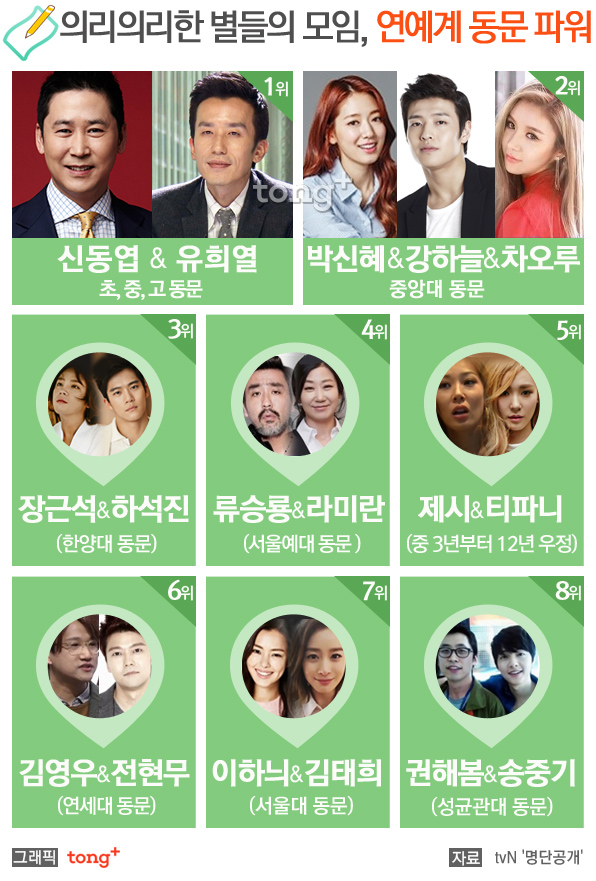 - ¿¬¿¹°è µ¿¹® ÆÄ¿ö 1À§´Â ½Åµ¿¿±°ú À¯Èñ¿ÀÌ Â÷ÁöÇß´Ù. µÎ »ç¶÷Àº Á¾·Î±¸ ÇÑ µ¿³×¼ ÀÚ¶õ 1»ì ÅÍ¿ïÀÇ Ä£ÇüÁ¦ °°Àº »çÀÌ·Î ÃÊ¡¤Áß¡¤°í ¼±ÈÄ¹è °ü°è´Ù. 2À§´Â ¹è¿ì ¹Ú½ÅÇý¿Í °ÇÏ´Ã, °É±×·ì ÇÇ¿¡½ºÅ¸ Â÷¿À·ç°¡ Áß¾Ó´ë µ¿¹®À¸·Î ¾Ë·ÁÁ³´Ù. À̾î 3À§´Â ÇѾç´ë µ¿¹®ÀÎ ¹è¿ì Àå±Ù¼®°ú Çϼ®Áø, 4À§´Â ¼¿ï¿¹´ë µ¿¹®ÀÎ ¹è¿ì ·ù½Â·æ°ú ¶ó¹Ì¶õÀÌ, 5À§´Â Áß 3³âºÎÅÍ ¸ÎÀº 12³â ¿ìÁ¤ÀÇ °¡¼ö ƼÆÄ´Ï¿Í Á¦½Ã°¡ À̸§À» ¿Ã·È´Ù.